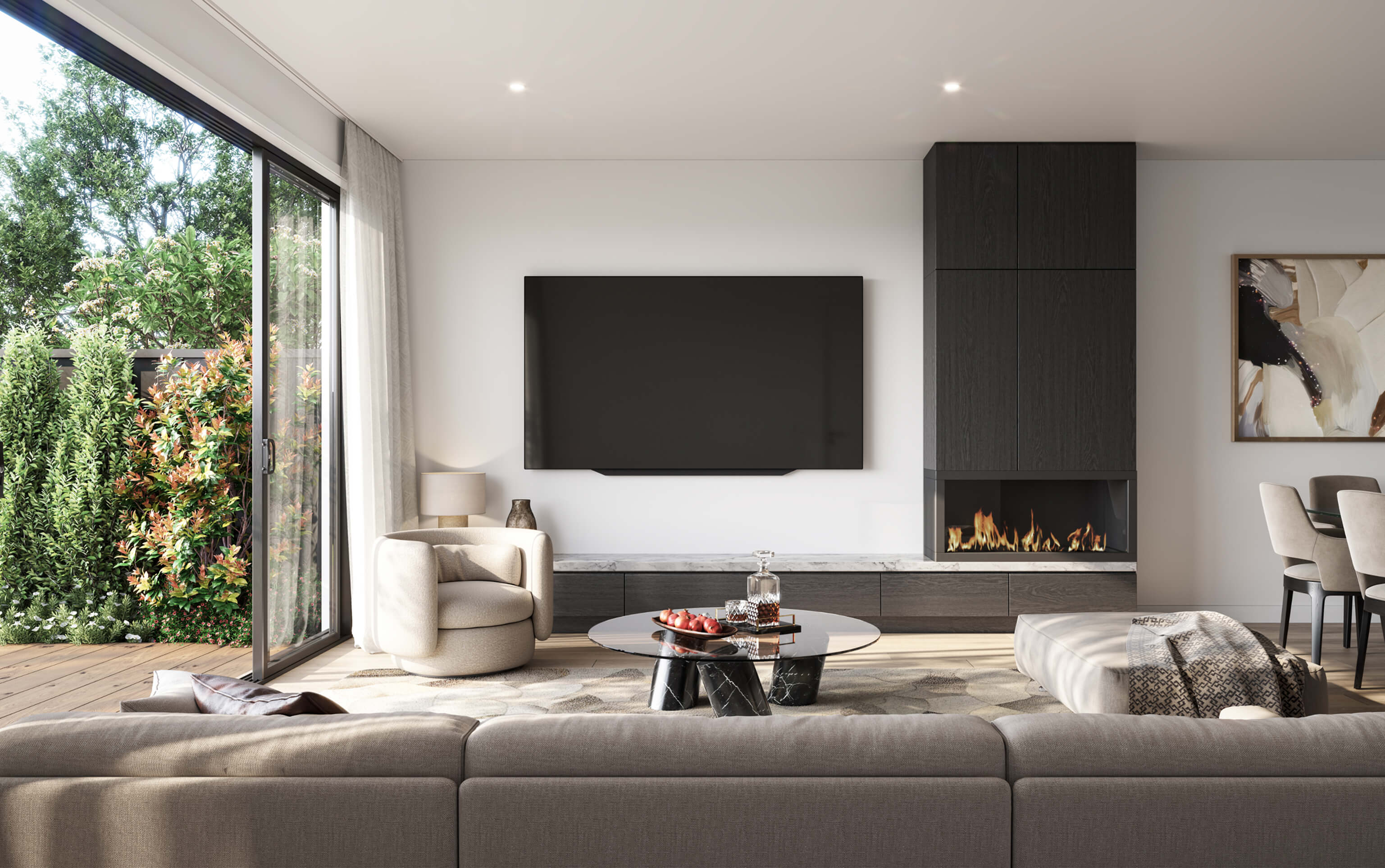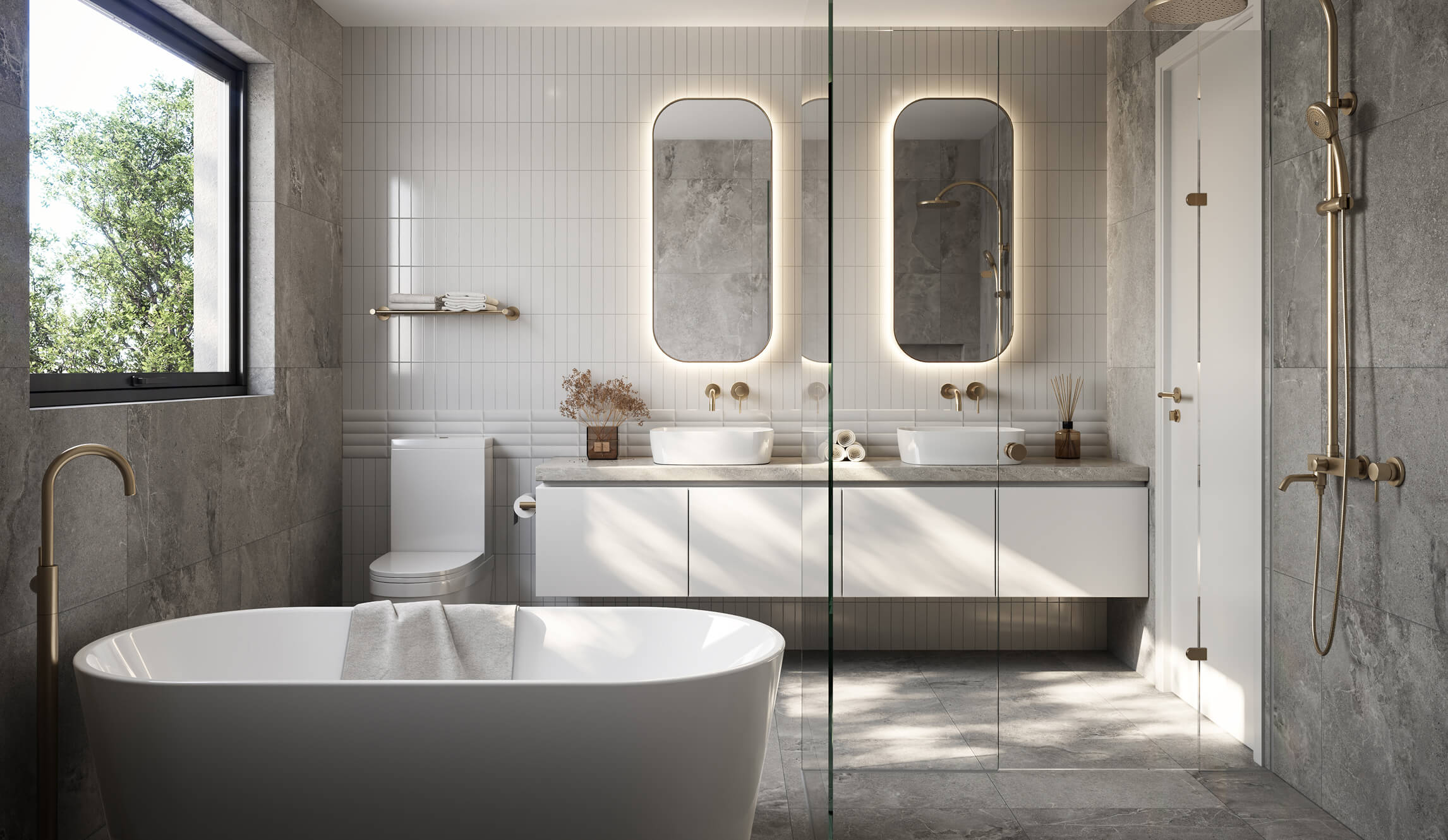 Rosemont’s dark scheme brings a bold sophistication to kitchens and bathrooms, with rich tones and sleek finishes that exude modern elegance. Kitchens feature concealed storage and Miele appliances, complemented by textured natural materials and bespoke joinery for a striking yet functional space. Bathrooms are serene retreats, blending refined dark finishes with contemporary fixtures and ample storage to create a sense of intimate luxury.